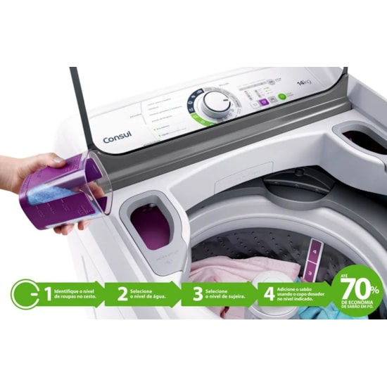 Já pensou em lavar mais gastando menos? A Nova Lavadora Consul 14kg conta com o sistema Dosagem Extra Econômica, você economiza até 70% de sabão em pó, e ainda garante que até seu edredom fica bem lavado, com o Ciclo Edredom Bem pensado.