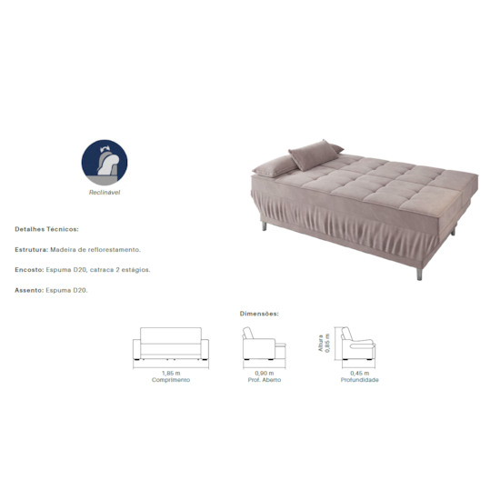 Sofisticação com um design pensado para a vida contemporânea, mesclando a praticidade e o conforto para seu o dia a dia. Seu econsto com com espuma D20 e com catraca com 2 estágios, o sei assento também conta com espuma D20. Sua estrutura é toda de madeira de reflorestamento.