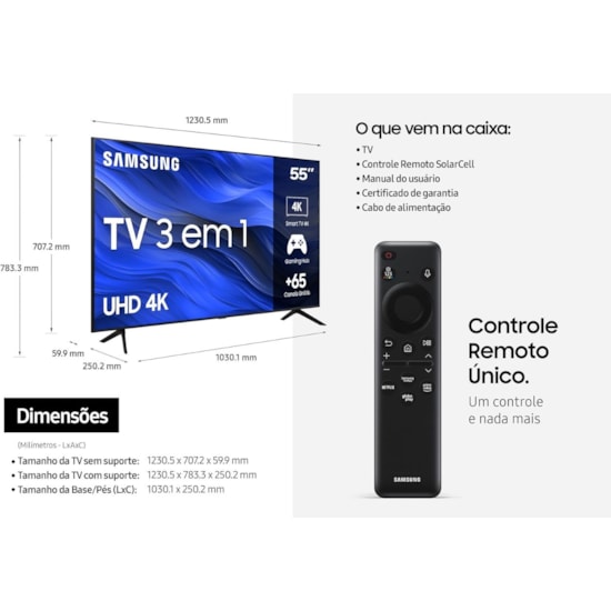 | Conteúdo da Embalagem: | 01 Televisor Samsung 55p, 01 Controle remoto e 01 Manual de instruções |