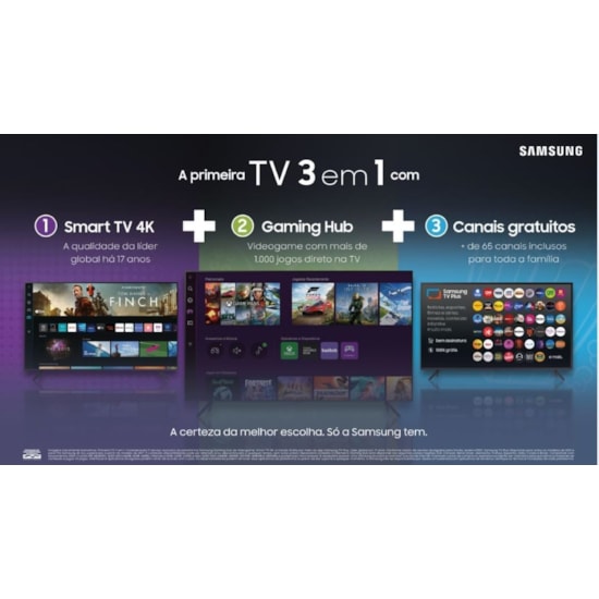 O processador Crystal 4K transforma tudo a que você assiste em resolução próxima à 4K. Acesso rápido aos seus apps e conteúdos favoritos com experiência otimizada de pesquisa, que sugere conteúdos com base em como você usa sua TV. O HDR aumenta o alcance dos níveis de luz na sua TV, proporcionando mais brilho, contraste e detalhes para você aproveitar o seu programa favorito tanto nas cenas mais escuras, quanto naquelas de alta luminosidade.